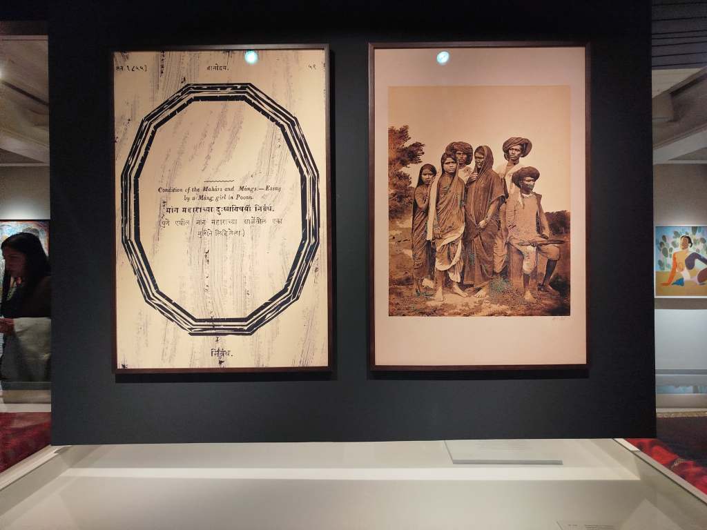 Na abordagem à luta e resistência na história da Índia, uma crítica à organização social, aos sistemas de castas, está a instalação “Tríptico Mukta Salve” de Rahee Punyashloka (n.1993) com o contundente manifesto da jovem estudante Mukta Salve baseado no texto “About the grief of the mangs and the mahars” (Sobre o luto dos Mangs e Mahars), considerado uma das primeiras obras de literatura feminista dalit. Aqui se concretiza a ideia da sociedade complexa indiana que referi-me na introdução deste artigo. É a literatura a ser chamada para o campo visual, em jeito de homenagem a uma figura que abordou num contexto delicado a vida da classe dos renegados do sistema de castas. A instalação contempla um retrato da página original da publicação denominada Dnyanodaya de 15 de Fevereiro de 1855, onde foi publicado pela primeira vez o manifesto com o título “Condição dos Mangs e Mahars – Ensaio de uma rapariga Mang em Poona”, publicada em inglês, hindi e marathi.