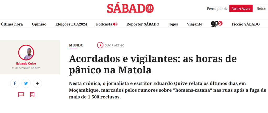 Um livro notável pela forma poética com que a interioridade do mundo urbano é revelada por vozes que, sendo anónimas, perdurarão na memória dos leitores. Neste livro de estreia em prosa Eduardo Quive conseguiu aquilo que muitos prosadores procuram durante a vida inteira: uma escrita ao mesmo tempo sensível e acutilante, encantada sem nunca se desamarrar de um quotidiano que exclui e anula a nossa partilhada humanidade.” — Mia Couto