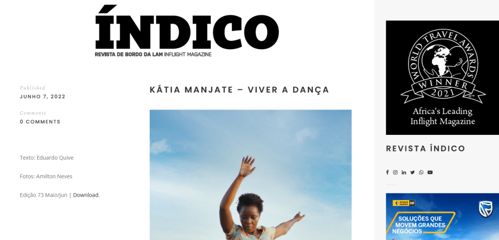 Aos 38 anos, Kátia Manjate, bailarina e coreógrafa, encara a carreira com a determinação que só em palco se define. Tudo começa quando, ainda a frequentar a Escola Primária 16 de Junho, pensou em alguma coisa para fazer depois das aulas e que não acarretasse custos para a mãe. Leia o texto completo