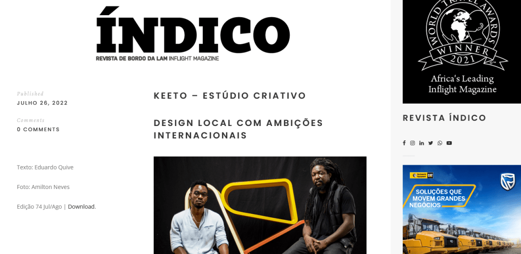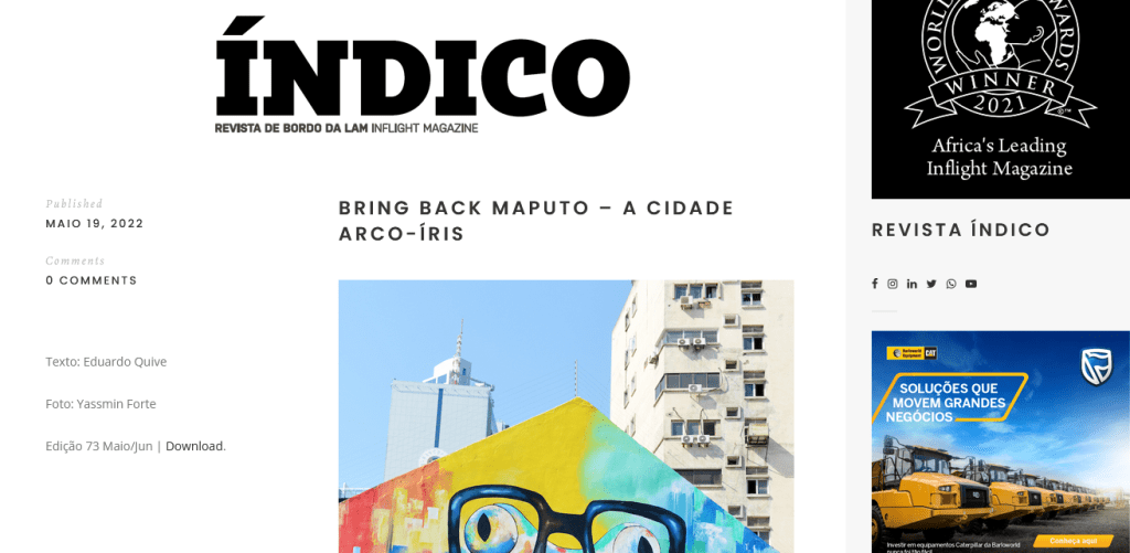 Desde finais de 2021 Eduardo Quive colabora com a ÍNDICO – Revista de bordo das Linhas Aéreas de Moçambique, escrevendo sobre artes. A publicação é bimensal e circula principalmente nos voos da LAM.