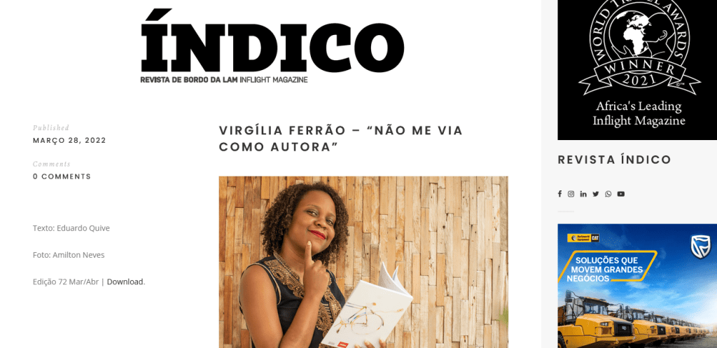 Virgília Ferrão, aos 36 anos de idade, é autora de três romances. Pelo mais recente, “Sina de Aruanda”, lhe foi atribuído o Prémio 10 de Novembro de Literatura. Sua escrita é reveladora de uma criatividade particular na literatura moçambicana, ela que nem se imaginava a publicar livros. Leia o texto completo